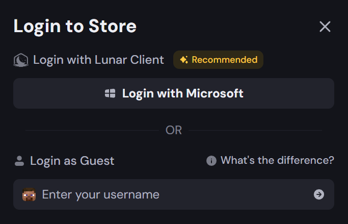 Step 1 – Log in to the store. Head to store.lunarclient.com and click Login at the top right, and Login with Microsoft.