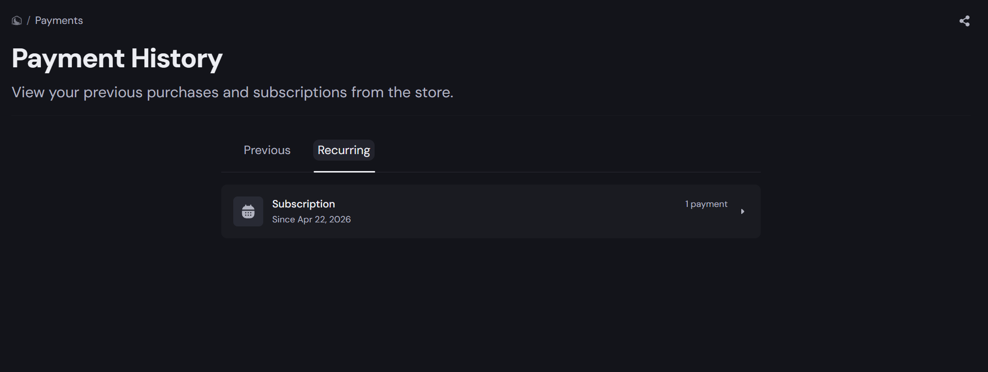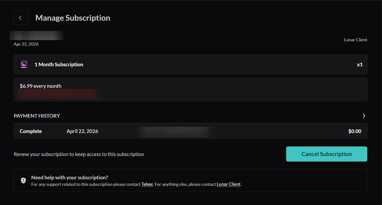 Step 3 – Open your recurring subscription. On the Payment History page, click the Recurring tab. You'll see your active Lunar+ subscription listed. Click on it to view the details.