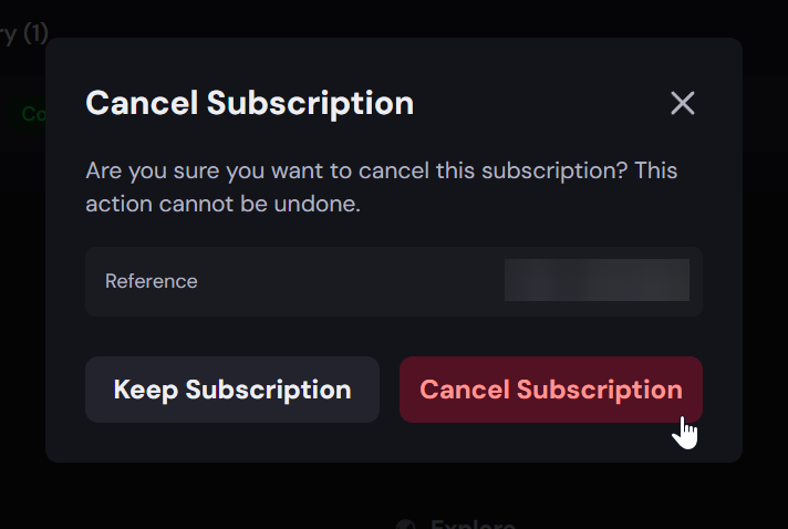 Step 5 – Confirm the cancellation. A confirmation pop-up will appear asking if you're sure you want to cancel. A confirmation pop-up will appear asking if you're sure you want to cancel. Verify the Transaction-ID is correct, then click the red Cancel Subscription button to confirm. If you've changed your mind, click Keep Subscription to go back.
