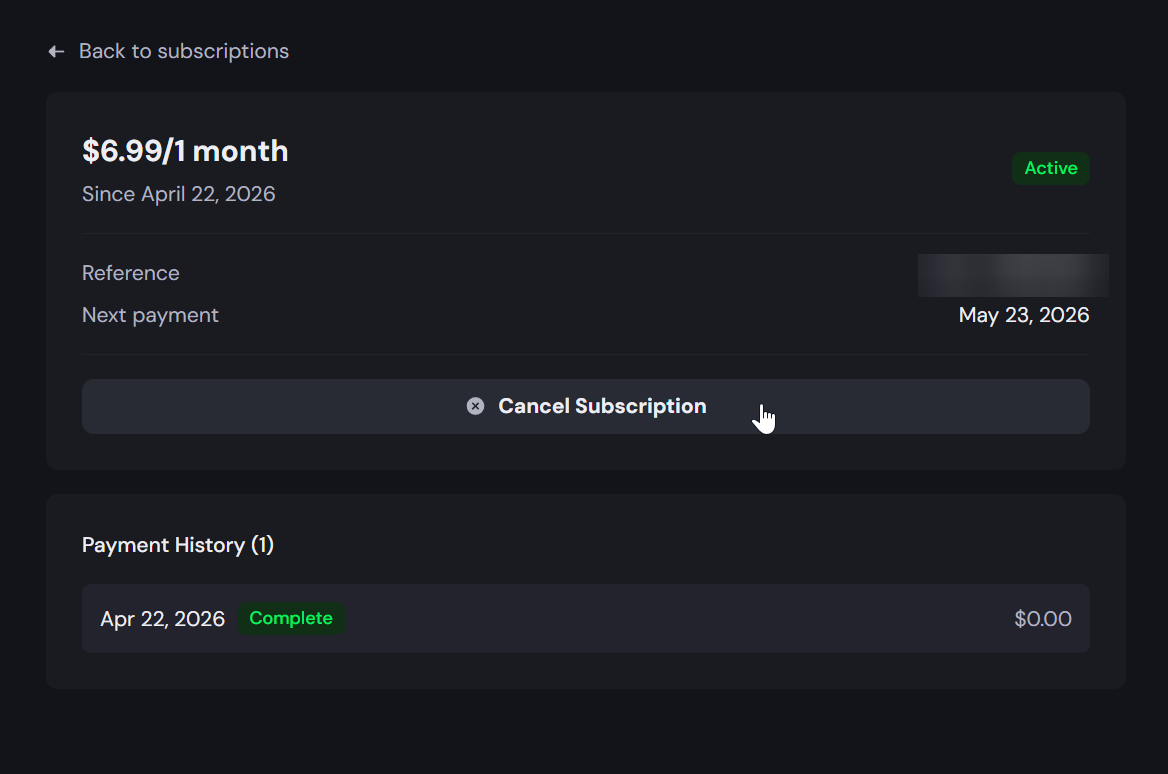 Step 4 – Cancel the subscription. On the subscription detail page, you'll see your billing amount, start date, and next payment date. Click the Cancel Subscription button to stop future charges.